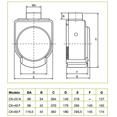Velocidade: 2350 rpm | Potência abs. desc. livre: 70W | Tensão (V): 230-50Hz | Caudal: 360m3/h | Nível de pressão sonora: 55 dB(A) | Conduta (diâmetro): 100 | Peso: 2.7 kg | Aparadeira de gordura | Filtro aço inoxidável | Desmontável | Regulávelencastre > exaustão encastre114.88NovoProduto disponível €114,88