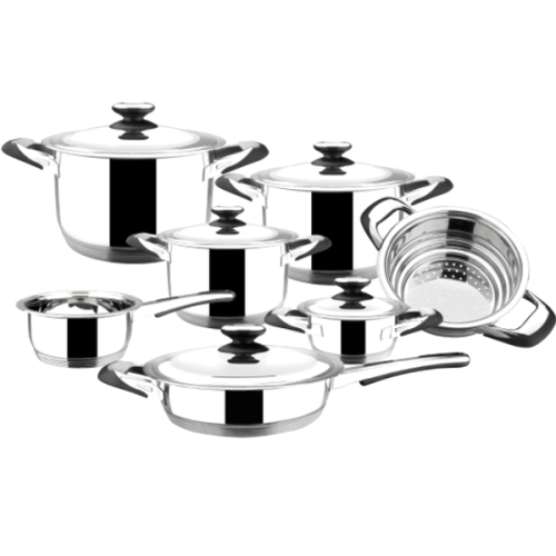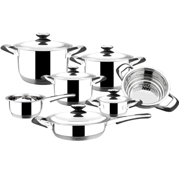 Fabricado em aço inoxidável de alta qualidade | Fundo difusor que garante uma distribuição rápida e homogénea do calor | Termômetros incorporados na tampa | Acabamento espelhado polido | Tampas em aço inoxidável | Indicado p/ gás, elétrico, vitrocerâmico e indução | Inclui: | - Panela c/ tampa de 24 cm: 24 x 15,4 cm. (diâmetro x altura). 6,9 lts | - Panela c/ tampa de 20 cm: 20 x 12,1 cm. (diâmetro x altura). 3,8 lts | - Panela c/ tampa de 18 cm: 18 x 9,1 cm. (diâmetro x altura). 2,3 lts | - Panela c/ tampa 16 cm.: 16 x 8 cm. (diâmetro x altura). 1,6 lts | - Caçarola 16 cm: 16 x 8,5 cm. (diâmetro x altura). 1,7 lts | - Vaporeira: 20 x 9,3 cm. (diâmetro x altura). 2,9 lts | - Frigideira c/ tampa 24 cm: 24 x 7,1 cmpequenos domésticos > cozinha148.59NovoProduto Limitado €148,59