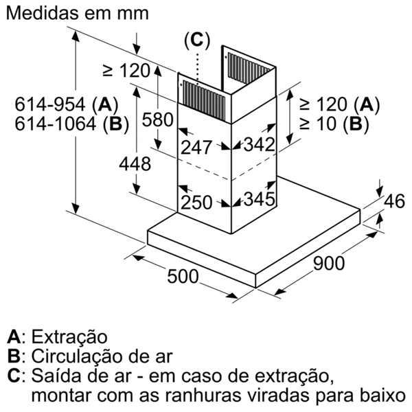 Medidas do aparelho em modo de saída de ar (AxLxP): 614-954 x 898 x 500 mm |