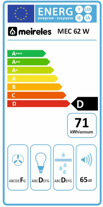 Exaustor convencional de 60cmBrancoComandos por botõesExtracção máxima 240 m3/hLâmpadas de LEDFiltro de alumínio lavávelClasse energética D