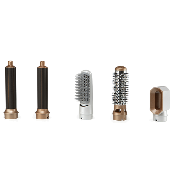 Acessórios: bocal de secagem, escova modeladora, modelador de cachos (rotação para a esquerda), modelador de cachos (rotação para a direita) e escova alisadora. |