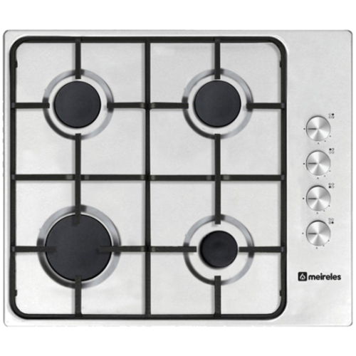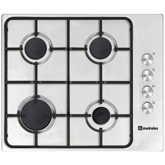 Placa a gás com 60cmAço inoxidável4 queimadores a gásAcendimento electrónicoVálvulas de segurançaManípulos lateraisGrelhas em esmalteGás Butano/Propano