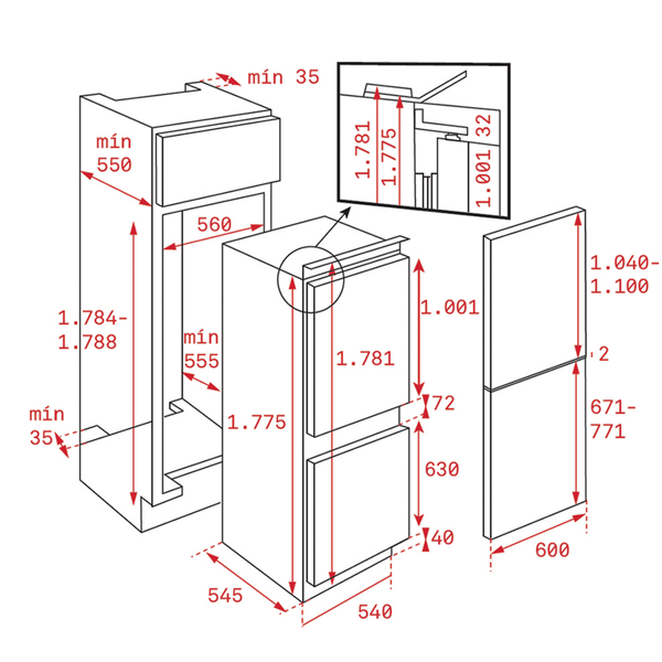 Combinado de integração | Controlo eletrónico com display | Motor inverter | Termostato regulável | 2 FreshBox | Iluminação LED | Descongelação automática no frigorífico | Indicador digital de temperatura | Garrafeira cromada | Bandejas de vidro reguláveis em altura | 4 prateleiras na porta | 3 gavetas no congelador com prateleiras de vidro | Alarme acústico | Pés dianteiros e traseiros reguláveis em altura | Portas reversíveis | Sistema de integração porta deslizante | Classificação energética: E | Classificação climática: SN-ST | Consumo de energia: 0,616 kWh/24h | Poder de congelação: 4kg/24 horas | Consumo de energia anual: 225 kWh/ano | Nível de ruído: 37 dBA | Tensão/Frequência: 220-240V / 50Hz | Volume total: 271lts | Medidas exteriores (axlxp) 1775x540x545mmencastre > frio encastre613.99NovoProduto disponível €613,99