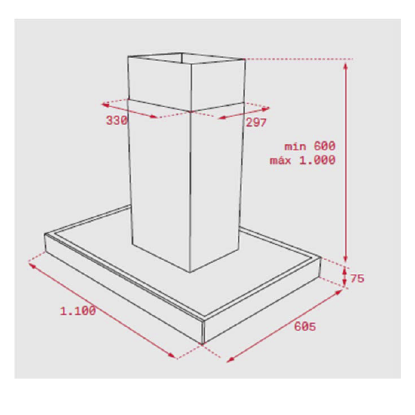 Chaminé decorativa de aspiração perimetral para instalação em ilha | Painel de comandos Touch Control com display digital branco | 4 lâmpadas LED | 3 velocidades + 1 intensiva | Indicador digital de velocidade selecionada | Programação do tempo de aspiração | Filtros metálicos interiores | Sistema de aspiração perimetral “Contour” | Painel rebatível em aço inoxidável com material fono absorvente | Indicador luminoso de saturação de filtros | Estrutura superior em vidro reforçado | Motor blindado de dupla turbina | Válvula antirretorno | Capacidade de extração: min. 331 m3/h – máx. 782 m3/h | Nível de potência sonora: min. 54 dBA – máx. 66 dBA | Possibilidade de funcionamento em recirculação (SET 1/T + adaptador) | Classificação energética: A | Dimensões gerais (axlxp): 817-1117 x 1100 x 605mm | Cor: Vidro Pretoencastre > exaustão encastre781.33NovoProduto Limitado €781,33