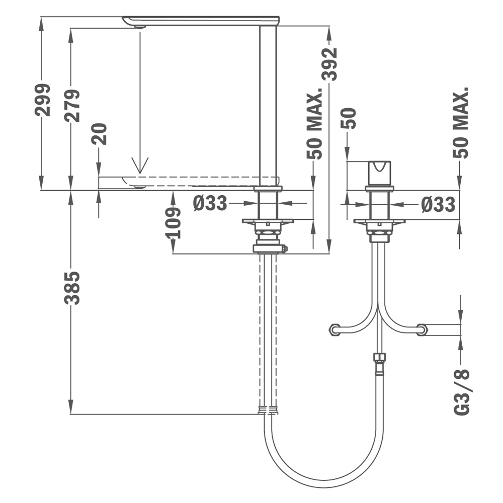 Monocomando retrátil com cano giratório | Máxima funcionalidade: extraível e retrátil | 2 posições (expandido 299 mm) e recolhido (20 mm) | São necessários dois orifícios distintos com Ø 35mm | Filtro anti calcário | Cartucho de discos cerâmicos | Tubos de alimentação flexíveis 3/8 | Cor: Cromadaencastre > misturadoras232.27NovoProduto disponívelMonocomando retrátil com cano giratório