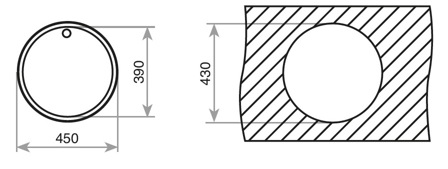 Lava-louças de encastreAço inoxidável 18/10Válvula de 3 ½”Profundidade da bacia 180 mmMóveis de 45 cmInoxMedida externa (diâmetro):450mm