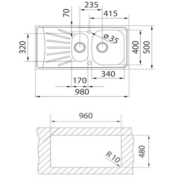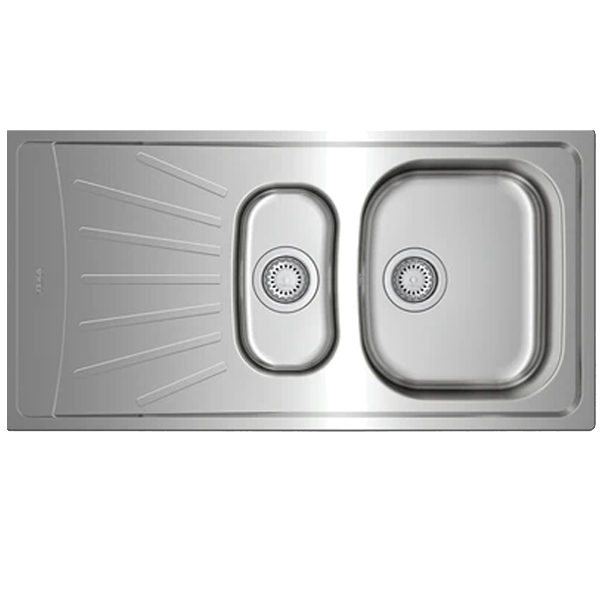 1 bacia de 340x400x160 mm1 bacia de 170x320x160 mmAplicação:encastrarAço inoxidável 18/10Válvula 3½”e sifãoMóveis de 60 cmDimensões (lxp):980x500mmCor:Inox