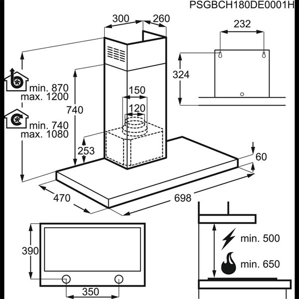 Instalação: Chaminé, 70 cm largura | Níveis de potencia: 3 | Potência de exaustão, nível máximo/mínimo: 360 / 210 m³/h | Ruído, nível máximo/mínimo: 65/52 dB(A) | Controlo por teclas | 2 lâmpadas de LED | Filtros: Modular de alumínio, 2 | Altura máxima: 1260mm | Altura, mm: 930 | Largura, mm: 698 | Profundidade, mm: 470 | Classe de eficiência energética: D | Cor: Inoxencastre > exaustão encastre344.81NovoProduto Limitado €344,81