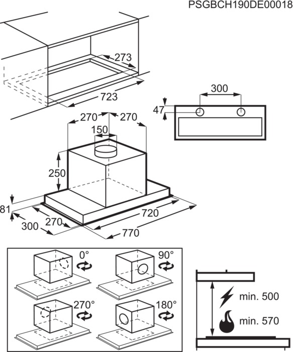Potência de exaustão,nível máximo/mínimo:580 / 300 m³/h