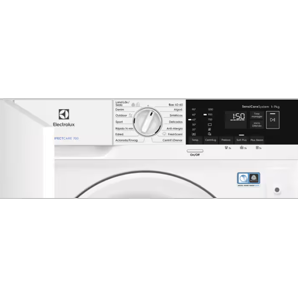 Funções:Ligar/Desligar,Seletor de temperatura,Centrifugação,Pré-lavagem,Soft Plus,Vapor Plus,Início diferido,Time Manager,Início/Pausa