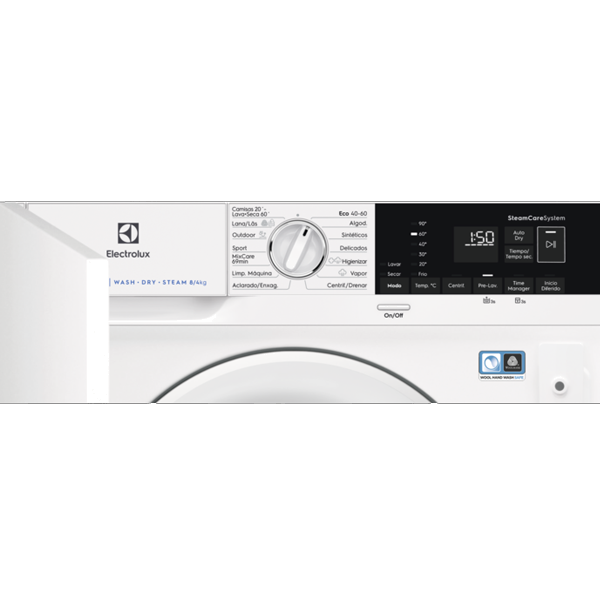 Funções:Ligar/Desligar,Modo,Seletor de temperatura,Centrifugação,Pré-lavagem,Time Manager,Tempo de secagem,Secagem auto,Início/Pausa,Início diferido