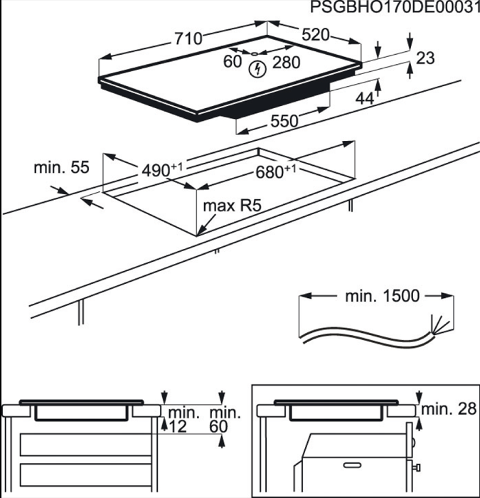 Dimensões de encastre (mm):44x680x490