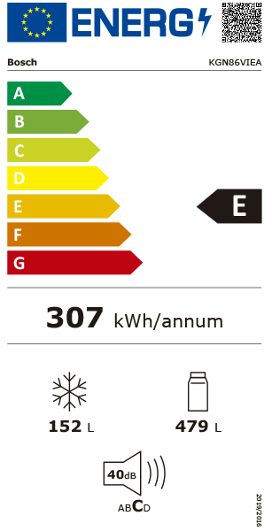 CONSUMO / CAPACIDADE | Classe de eficiência energética: E | Consumo anual de energia (kWh/ano): 307 kWh/ano | Volume líquido total : 631 litros | Volume líquido do frigorifico: 479 litros | Volume líquido do congelador: 152 litros | Emissão de ruído (dB(A) re 1pW): 40 dB | Capacidade de congelação (kg/24 h): 10 kg | Classe Climática: SN-T | Super congelação | Tempo de aumento da temperatura: 17 horas