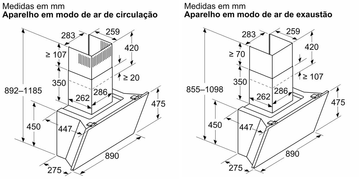 Medidas do aparelho com o módulo de recirculação de ar (AxLxP):892-1185 x 890 x 447 mm