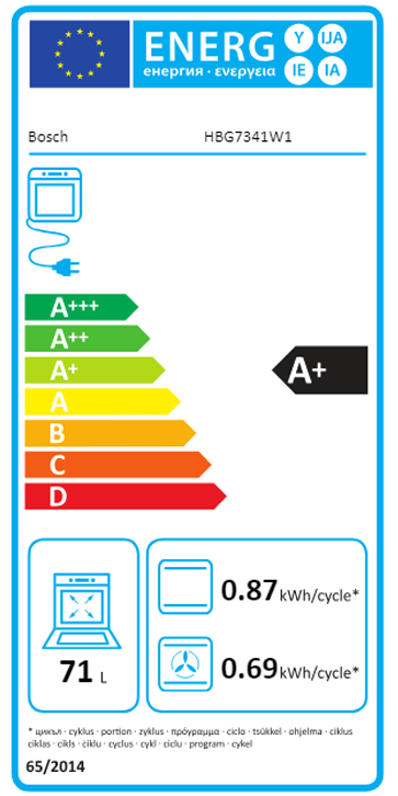 Classe de eficiência energética: A+ (numa escala de classes de eficiência energética de A+++ até D), Consumo de energia por ciclo na função de aquecimento convencional (ar quente): 0.87 kWh |