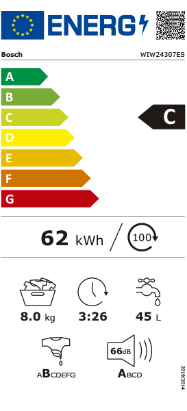 ETIQUETA EFICIÊNCIA ENERGÉTICA | Classe de Eficiência Energética¹: C | Energia² / Àgua³: 62 kWh / 45 litros | Capacidade de Carga: 1 - 8 kg | Classe de Eficiencia de Centrifugação: B | Potência de Centrifugação / Velocidade de Centrifugação**: 400 - 1200 r/min | Nível de Ruído: 66 dB (A) re 1 pW | Classe de Eficiência de Ruído: A | Totalmente integrável | Programas standard: Algodão, Sintetico, Delicado, Lã/Lavagem manual | Programas especiais: Camisas/Blusas, Escoar Àgua / Centrifugação, Rápido/Mix, Enxaguamento, Rápido 15/30 min