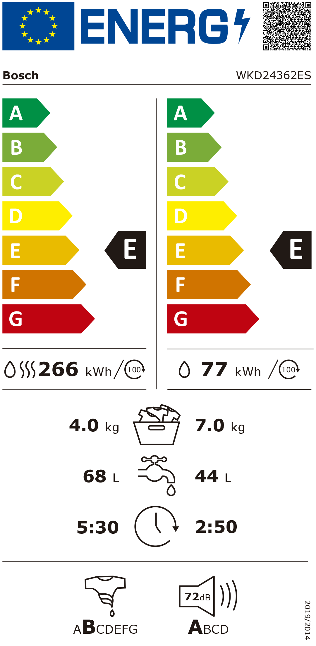 ETIQUETA EFICIÊNCIA ENERGÉTICA | Classe de eficiencia energética Lavar e Secar: E | Classe de Eficiência de Lavagem: E | Energia / Água Lavar e Secar: 266 kWh / 68 litros | Energia / Água Lavar: 77 kWh / 44 litros | Capacidade de carga Lavar e Secar / Lavar: 1 - 4 kg / 1 - 7 kg | Classe de eficiência de Centrifuação: B | Potência de Centrifugação / Velocidade de Centrifugação: 600 - 1355 r/min | Nível de ruído: 72 dB (A) re 1 pW | Classe de Eficiência de Ruído: A