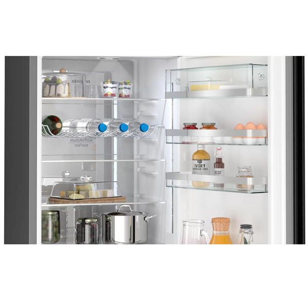 FRIGORÍFICO | Sistema multiAirflow | Parede posterior em metal com multiAirflow | 5 prateleiras de vidro, 3 ajustáveis em altura | Bottle rack: Suporte para garrafas cromado, Bottle cooler | 3 prateleiras na porta, das quais, das quais 1 compartimento para manteiga/queijo e 1 prateleira da porta alta | Compartimento para manteiga/queijo | 1 prateleira(s) grande(s) na porta, 2 prateleiras pequenas na porta