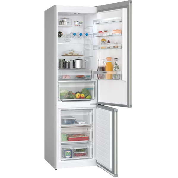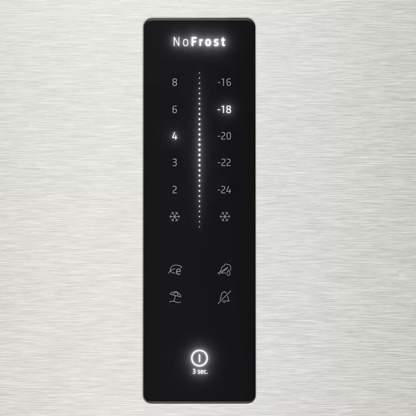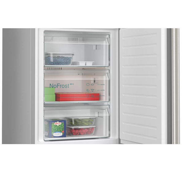 CONFORTO E SEGURANÇA | noFrost - descongelação automática | Regulação eletrónica da temperatura através de display LED | 2 circuitos de frio independentes com regulação separada da temperatura para Frigorífico e Congelador | Função super refrigeraçăo | Alarme óptico e acústico de porta aberta | Alarme óptico e acústico para falha no compartimento de congelação