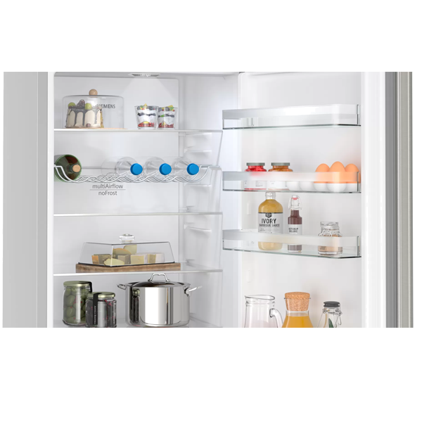 FRIGORÍFICO | Sistema multiAirflow | Parede posterior branca com multiAirflow | 5 prateleiras de vidro, 3 ajustáveis em altura | Bottle rack: Suporte para garrafas cromado | 1 prateleira(s) grande(s) na porta, 3 prateleiras pequenas na porta