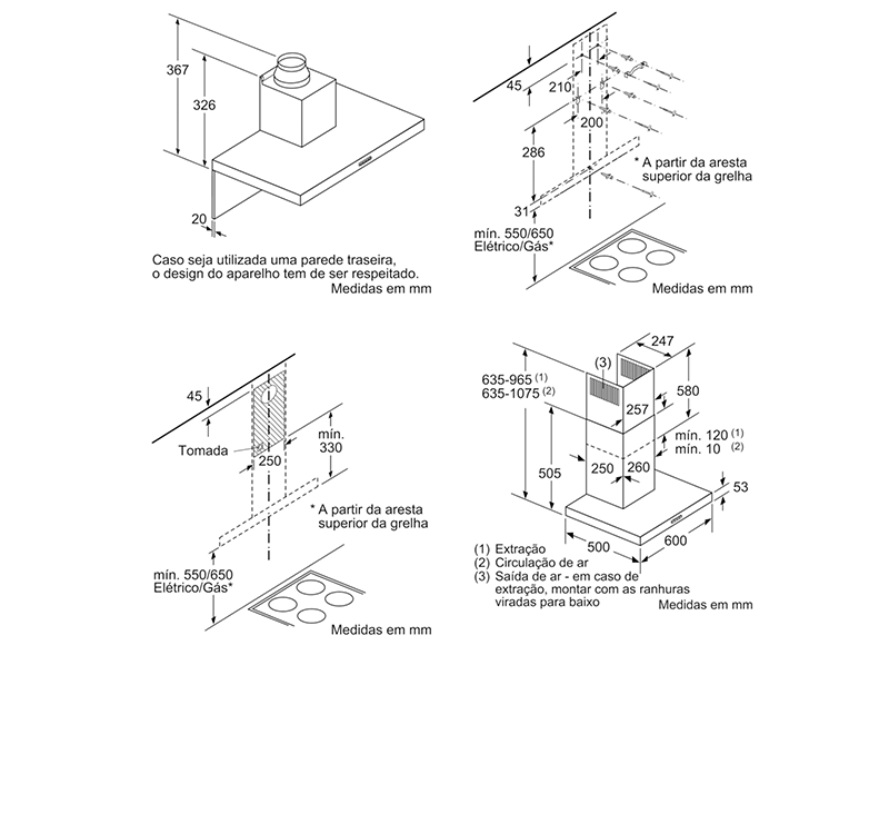 MEDIDAS (mm): | Medidas do aparelho em saída de ar (AxLxP): 635-965 x 600 x 500 mm | Medidas do aparelho em recirculação de ar (AxLxP): 635-1075 x 600 x 500 mm | Diâmetro da conduta Ø 150 mm (Ø 120 mm incluído) | Potência de ligação: 255 W | Válvula anti-retorno incluídaencastre > exaustão encastre432.19NovoProduto disponível €432,19
