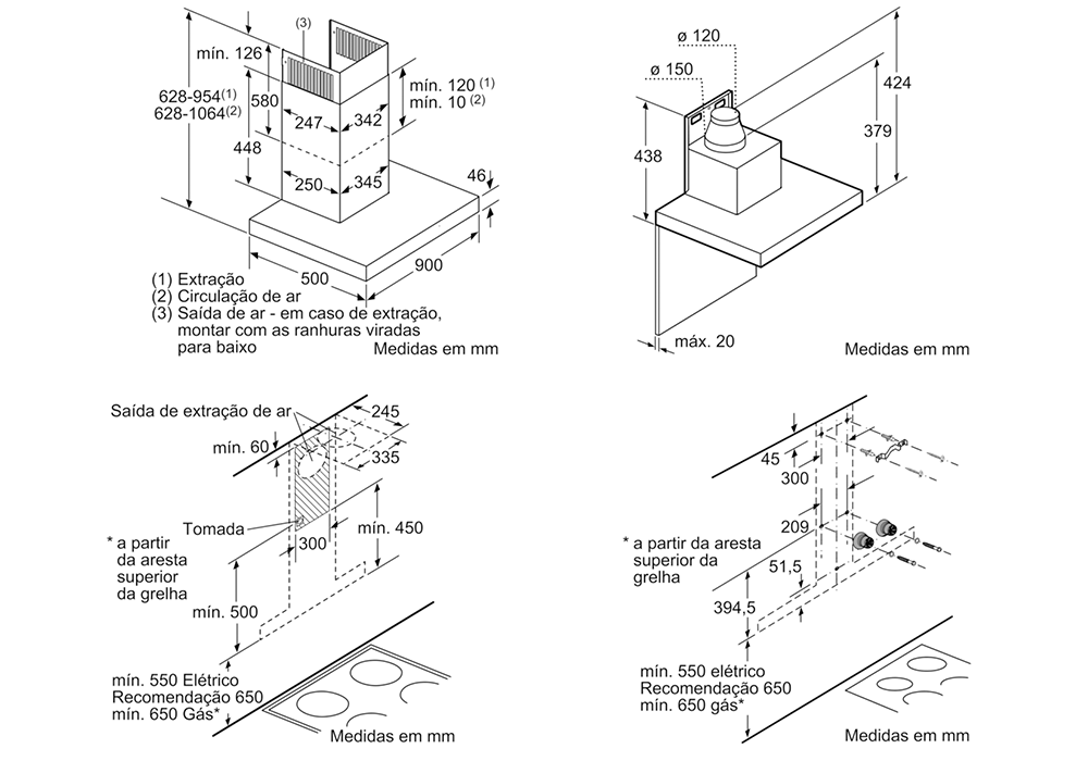 MEDIDAS (mm): | Medidas do aparelho em saída de ar (AxLxP): 628-954 x 898 x 500 mm | Medidas do aparelho em recirculação de ar (AxLxP): 628-1064 x 898 x 500 mm | Medidas em recirculação com o módulo CleanAir (AxLxP): | 689 x 898 x 500 mm - montagem com chaminé exterior | 809-1139 x 898 x 500 mm - montagem com chaminé telescópica | Diâmetro da conduta Ø 150 mm (Ø 120 mm incluído) | Potência de ligação: 265 W | Válvula anti-retorno incluídaencastre > exaustão encastre781.33NovoProduto Limitado €781,33