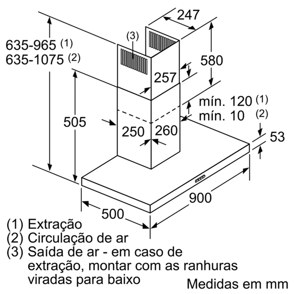 Medidas do aparelho em modo de saída de ar (AxLxP): 635-965 x 900 x 500 mm |