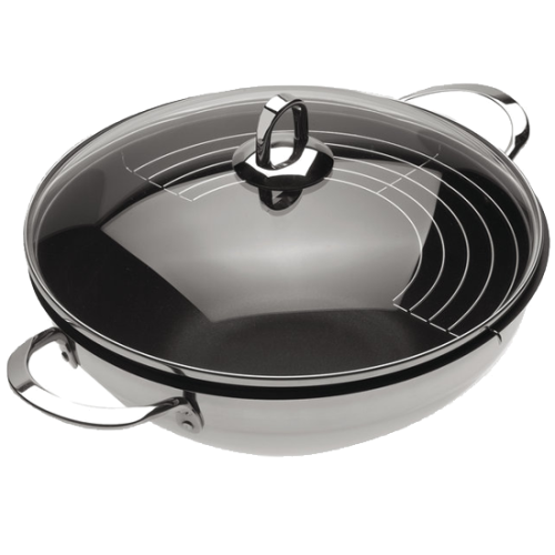 Panela wok 28 anti aderente com tampa de vidro:panela em aço inoxidável e tampa de vidro.