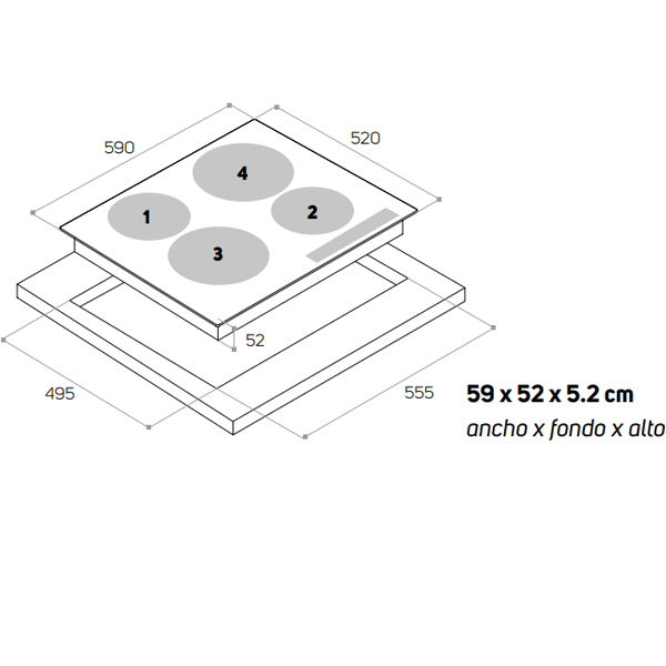 Dimensões (LxPxA): 59x52x5,2cmencastre > placas123.56NovoProduto disponívelPlaca radiante com 4 zonas de aquecimento
