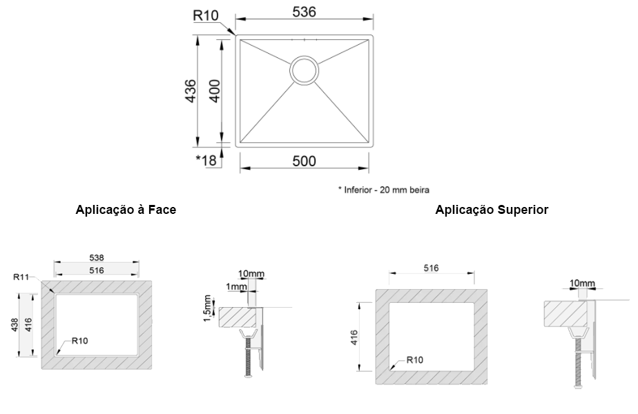 Medida externa: 536x436mm | Medida das cubas: 500x400mm | Profundidade: 200mm | Fornecido Com: Sifão/Válvula manual de cesta 0212249S | Tamanho do móvel: 600mm | Aplicação: Superior e à face | Acabamento: Escovadoencastre > lava louças319.74NovoProduto Limitado €319,74