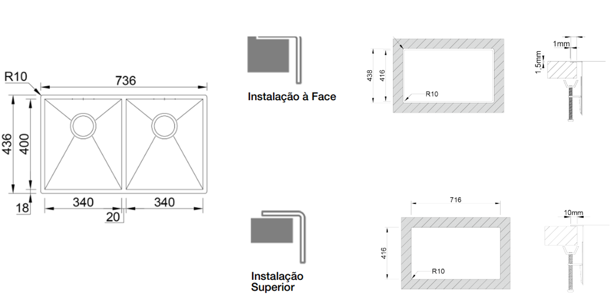 Medida externa: 736x436mm | Medida das cubas: 340x400/340x400mm | Profundidade: 200mm | Fornecido Com: Sifão/Válvula manual de cesta 0222249S | Tamanho do móvel: 800mm | Acabamento: Escovado | Aplicação: À face e superiorencastre > lava louças485.71NovoProduto Limitado €485,71