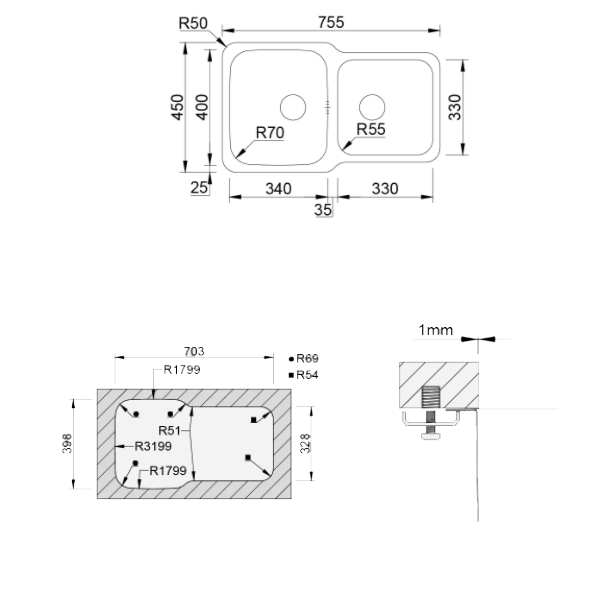 Medida externa: 755x450mm | Medida cubas: 340x400 / 330X330mm | Profundidade: 200mm | Móvel: 800mm | Acabamento: Polido | Aplicação: Inferior | Inclui: Sifão/Válvula manual de cestaencastre > lava louças236.76NovoProduto Limitado €236,76