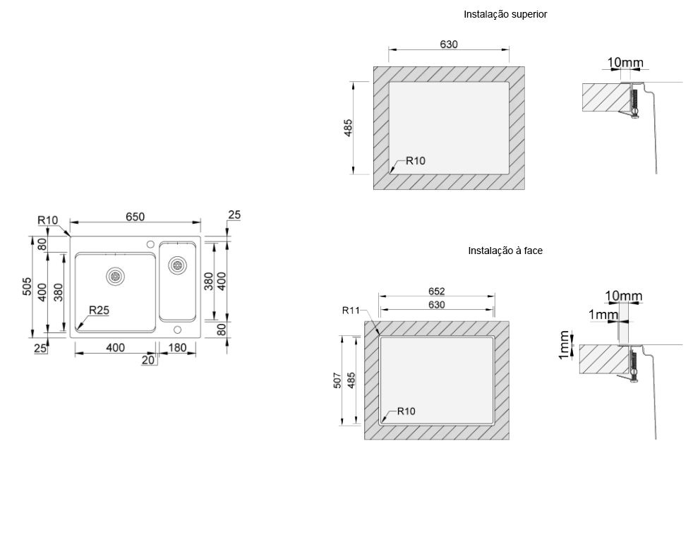 Medida externa: 650x505mm | Medida cuba: 400x400 / 180x400mm | Profundidade: 200 / 150mm | Fornecido Com: Sifão/Válvula automática de cesta 0722222 + Tábua VERSUS 03562 | Móvel: 800mm | Acabamento: Polido | Aplicação: Á face e superiorencastre > lava louças415.69NovoProduto Limitado €415,69