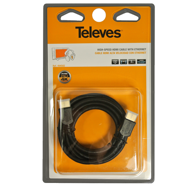 Cabo HDMI de alta qualidade para conectar a uma TV, qualquer equipamento electrónico (receptor de TV, computador portátil, consola de jogos...) e disfrutar os conteúdos em alta definição (HDTV). | Standard HDMI High Speed with Ethernet (Alta Velocidade com Ethernet) | Ultra Alta Definição: compatível 4K UHD | Construído com condutores multifilar de cobre | Grande blindagem: Blindagem completa, com entrelaçados de alumínio/cobre e nos pares, com lâmina de alumínio | Certificação “HDMI Licensing LLC”, sendo Televés a empresa licenciada | Disponível em diferentes comprimentos | Conexão macho-macho | Cobertura em PVC de cor negra (de interior) | Pares entrelaçados | Cablagem de 19 pinos | Inclui protectores plásticos para evitar o desgaste dos conectores quando são desligadosrecepção instalação tv-sat > tdt/sat5.96NovoProduto disponívelCabo HDMI de alta qualidade para conectar a uma TV,qualquer equipamento electrónico (receptor de TV,computador portátil,consola de jogos...) e disfrutar os conteúdos em alta definição (HDTV).