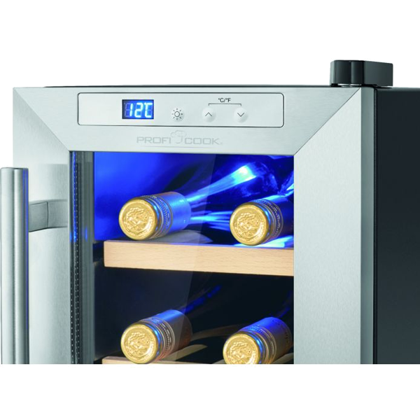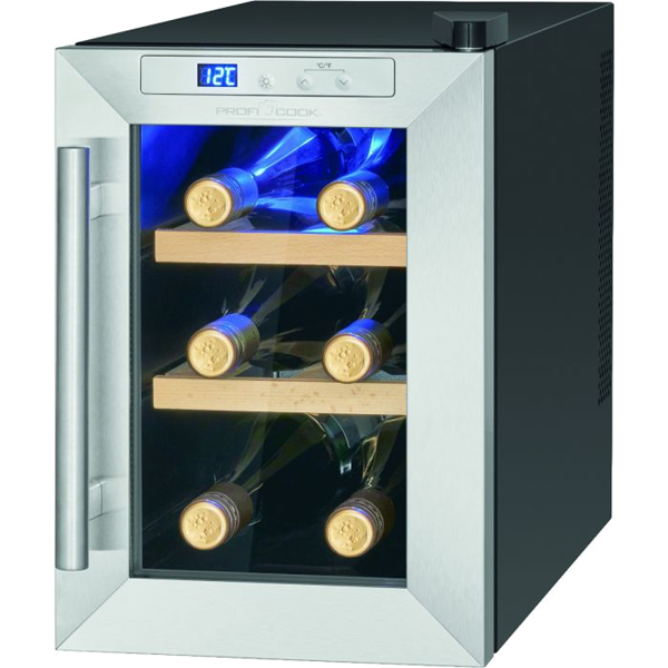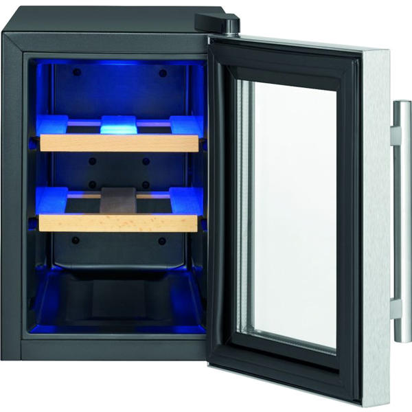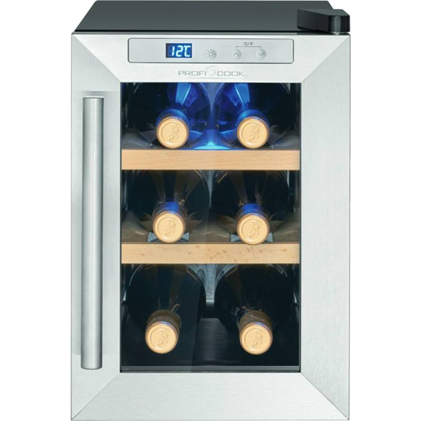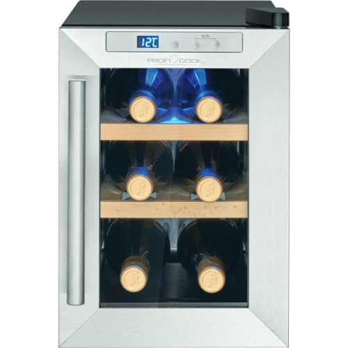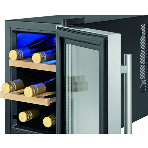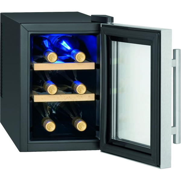 Capacidade da garrafa: 6 x 0,75 litros | Capacidade líquida: 17 litros | Resfriamento termoelétrico (sem compressor) | Sistema antivibração (baixo ruído ≤ 26 dB) | Controle de botão | Painel de controle com display LED (iluminado em azul) | Controle e ajuste eletrônico de temperatura | Configuração e exibição digital de temperatura | Faixa de temperatura: +11 °C a +18 °C (o valor alcançável não pode exceder a temperatura ambiente no local de instalação) | Iluminação interior LED azul (comutável) | 3 níveis de armazenamento com 2 prateleiras de madeira removíveis | Porta de vidro resistente aos raios UV (vidro triplo) | Cor da caixa: preto | Batente de porta à direita | Pés ajustáveis | Classe climática: N (+16°C a +32°C) | Refrigerante: R600a | Consumo de energia / 24 h: 0,518 kWh | Consumo de energia/ano: 189 kWh | Dimensões (axlxp) 395x246x500mmpequenos domésticos > cozinha256.64NovoProduto Limitado €256,64