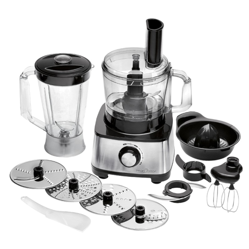 Processador com motor de 1200 W máx. | Revestimento e acessórios em Inox de alta qualidade | 3 funções incluídas: Processador de alimentos, liquidificadora, espremedor de citrinos | Velocidades variáveis e turbo, função picadora de gelo e batidos | Copo graduado com 1,2 L de capacidade | Recipiente misturador graduado com 1,75 L de capacidade | Pés de borracha para fácil aderência | Circuito de segurança | 11 Acessórios: aplicação para sumo, 2 discos (fino e grosso) para corte, disco para batatas, disco para juliana, batedeira, lâmina de guilhotina, lâmina de aço inoxidável, Varas especiais para amassar, raspador de massa, varas em metalpequenos domésticos > cozinha114.88NovoProduto Limitado €114,88