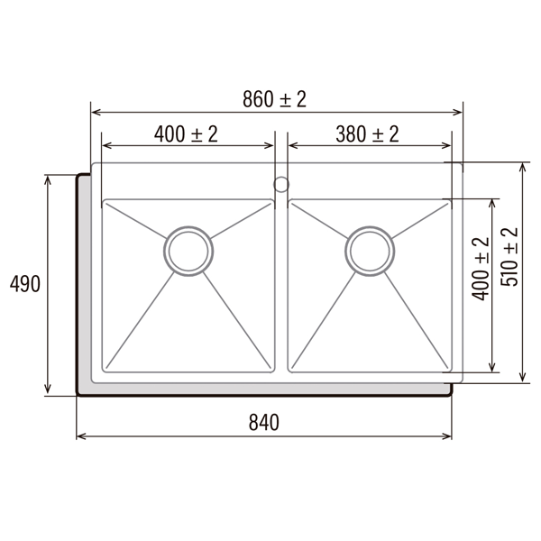 Dupla cuba quadrada com raio de 10 mm |