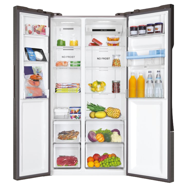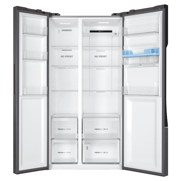 Instalação: Instalação livre | Categoria de Produto: Frigorífico | Tipo de produto: Side by side | Tecnologia de frio: No Frost | Painel | Coluna de circulação de ar Multiflow | Processo de descongelação da secção do frigorífico: Automático | Processo de descongelação da secção do congelador: Automatica no frost | Junta de borracha: Empurrar | Corrente (A): 1.8 | Frequência (Hz): 50 | Voltagem (V): 220-240 | Interface de comando: Eletrónico | Localização dos comandos: Painel comandos na porta | Indicador de porta aberta - frigorífico: Acústico | Temperatura ajustável: Frigorífico - congelador | Congelação rápida | Férias | Função Super refrigeração | Cor/Material do corpo: Silver | Número de gavetas de congelação: 2 | Frigorífico com ventilador interno | Material das prateleiras: Vidro | Prateleiras da porta: Perfil em silver | Material das prateleiras da porta: Plástico cristalino | Acabamento das prateleiras: Perfil em silver | Número total de prateleiras da porta: 6 | Pegas: Pegas integradas confortáveis | Luz: Led | Número de gavetas: 2 | Número de suportes para os ovos: 1 branco | Número de covetes para gelo: 1 transparente | Número de prateleiras ajustáveis no compartimento do frigorífico: 2 | Classe Energética: E | Classe de ruído: C | Nível de ruído dB(A): 38 | Consumo anual de energia: 317 | Classe climática: SN | Capacidade total do compartimento de refrigeração (l): 330 | Capacidade total do compartimento de congelação (l): 191 | Capacidade total (l): 521 | Classificação por estrelas: 4 | Autonomia em caso de falha de energia (h): 5 | Capacidade de congelação (kg): 10 | Altura: 1775mm | Largura: 908mm | Profundidade: 647mmlivre instalação > frio livre instalação940.38NovoProduto Limitado €940,38