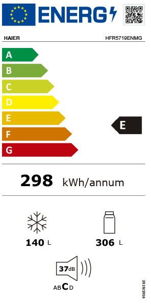 CARACTERÍSTICAS PRINCIPAIS | Classe de eficiência energética: E | Total No Frost | Capacidade líquida total: 446 L | Capacidade líquida do frigorífico: 306 L | Capacidade líquida do congelador: 140 L | Nível de ruído: 37 dBA | Classe de ruído: C