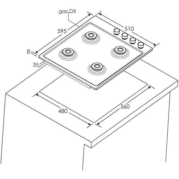 OUTROS DADOS | Dimensões do produto AxLxP: 8x59,5x51 cm | Peso do produto: 7,2 Kg | Dimensões necessárias para o encastre LxP: 56x48 cmencastre > placas114.01NovoProduto disponívelTipo:4 a Gás