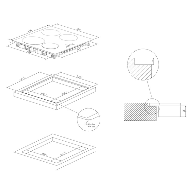 OUTROS DADOS | Dimensões do produto AxLxP: 6,2x59x52 cm | Peso do produto: 8,6 Kg | Dimensões necessárias para o encastre LxP: 56x49 cmencastre > placas203.30NovoProduto disponívelTipo:Indução