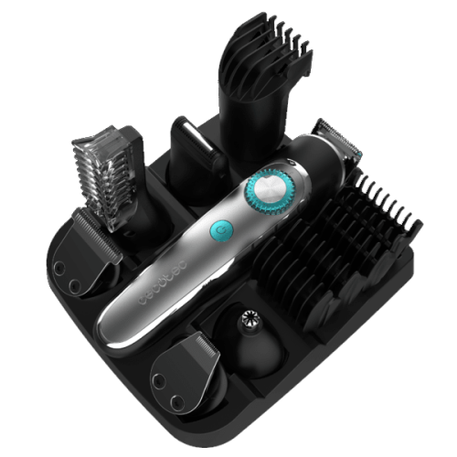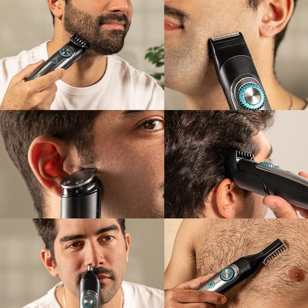 Multigrooming com 6 cabeças,com 5 pentes nos tamanhos 3/6/9/12/15 mm,e 2 pentes reguláveis de 1 a 10 mm e de 11 a 20 mm,um pente para o corpo e resistência IPX7.