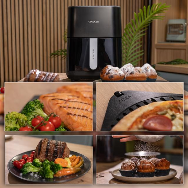 3 em 1: cozinhe tudo com a sua Cecofry graças ao seu design que incorpora uma fritadeira, um grelhador de carne e uma grelha para preparar pizzas com uma massa perfeita. |